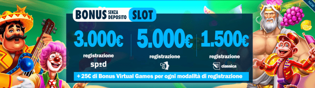 - Puoi approfittare di un bonus slot senza deposito che non ha rivali in Italia, pari a 5.000€ per le slot machine, così da divertirti senza alcun rischio. Per ottenerlo devi però registrarti tramite Carta di Identità Elettronica, altrimenti il bonus è di 3.000€ con SPID, mentre con form tradizionale è di 1.000€.
